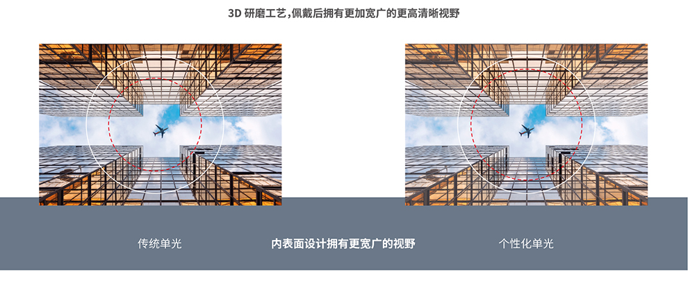 ○ 内表面设计相比传统单光,视野更宽广